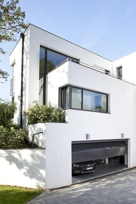 5. Porta de garagem de batente. Composta por dois painéis que abrem para o exterior. As portas de garagem de batente recorrem geralmente a sistemas motorizados com braços.