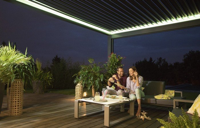 Diga "cena barbecue" para o seu assistente de voz. As lâminas reguláveis da pérgola fecham-se e as telas gbaixam - para garantir o isolamento face às temperaturas mais frescas da noite -, as luzes ligam-se e a música começa a tocar.